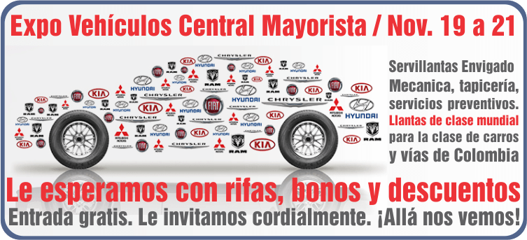 Muy cordialmente le invitamos con sus familiares y amigos a esta exposición y venta de autos del 19 al 21 de noviembre del presente año. Tendrá lugar en la Central Mayorista, bloque 31, primer piso. La asistencia es gratuita. Habrá competencia de de car, audio y tuning. Se exhibirán nuevos modelos de autos y motos clásicos. Nosotros tendremos allá nuestra propia exhibición y les esperamos con descuentos hasta del 20% en llantas, bonos para cambios de aceite y rifas de accesorios para sus vehículos. Habrá además rifa de dos vuelos en helicóptero a Guatapé. Puede solicitar mayores informes en el 285 4815, ext. 123.